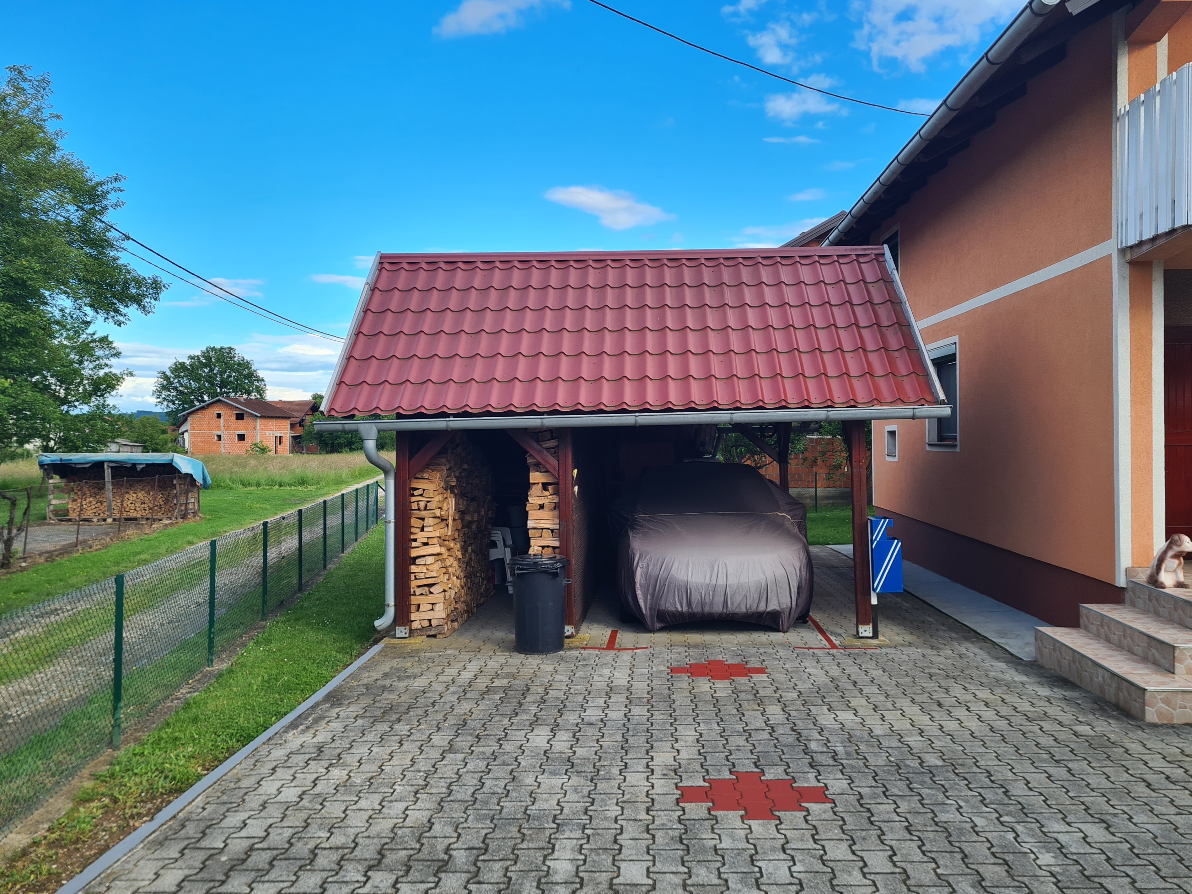 Pored kuće postoje i dva pomoćna objekta. Veći pomoćni objekat služi kao natkrivena garaža i drvarnica, dok manji objekat služi kao još jedna ostava.