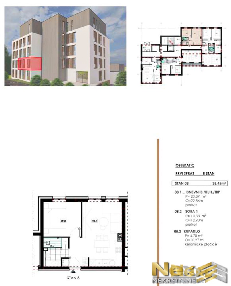 Stan se sastoji od: hodnika, kuhinje, dnevnog boravka sa trpezarijom, kupatila i spavaće sobe.