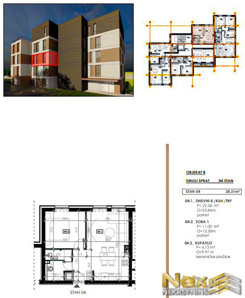 Stan se sastoji od: hodnika, kuhinje, dnevnog boravka sa trpezarijom, kupatila, i spavaće sobe.