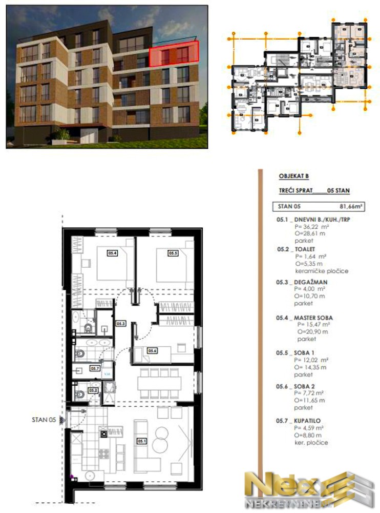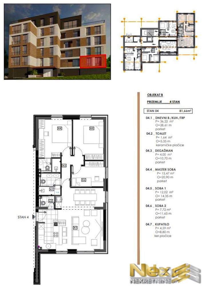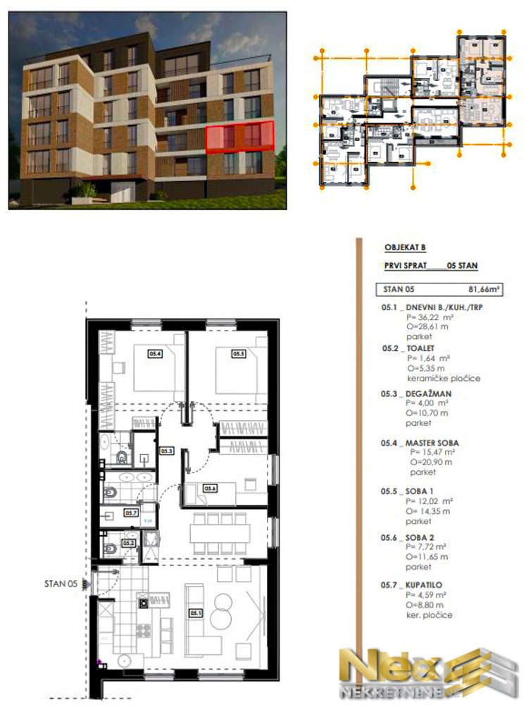 Stan se sastoji od: hodnika, kuhinje, dnevnog boravka sa trpezarijom, kupatila, toaleta, degažmana, Master sobe i 2 spavaće sobe.