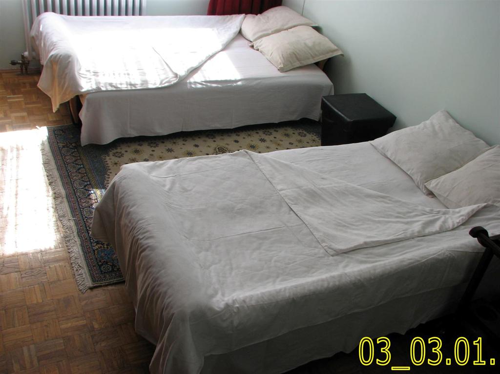 Soba: 2 dupla lezaja (trosjeda na rasklapanje); komplet posteljina i rucnici za 2 (3) osobe.