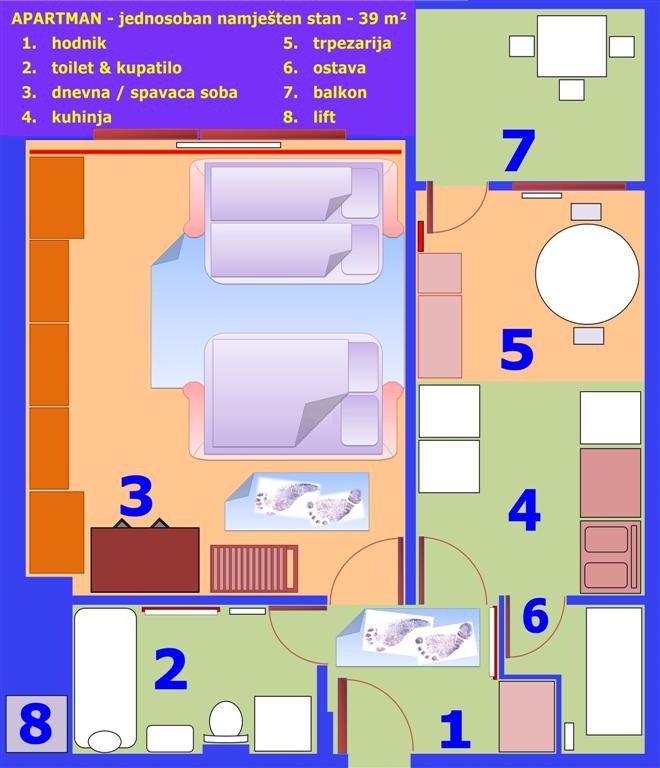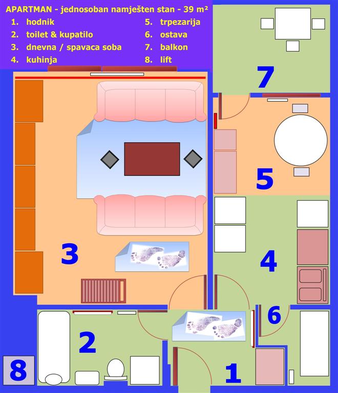 Sadrzaj: hodnik, kupatilo, soba, kuhinja sa trpezarijom, ostava i balkon. Apartman je suncan. Solidno je i komplet opremljen. Moze se upotrijebiti kao mjesto duzeg stanovanje ili za ferije. Smjesten u visespratnici / stambenoj zgradi izuzetno kvalitetne gradnje. Apartman je smjesten u izuzetno porodicnom, mirnom i cistom kvartu, punom zelenila, parkova i prodavnica.