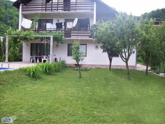 Kuca je velcine 16x9 (sa garazom i kotlovnicom) tj. tri dvosobna stana sa zajednickim stubistem odvojenih ulaza! Na prvom spratu u dnevnoj sobi se nalazi veliki zidani kamin od kamena. Prvi i drugi sprat imaju velike balkone a prizemlje posjeduje veliku terasu spojeno sa bazenom. Dimenzije bazena su 9x5, dubina bazena je 1,5m. Pored bazena se nalazi bunar i veliki kamin. Imanje je ogradjeno prirodnom ogradom (smreka)!