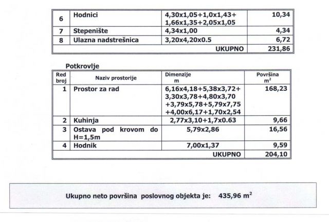 Ukupna neto površina poslovnog objekta je 435,96 m²