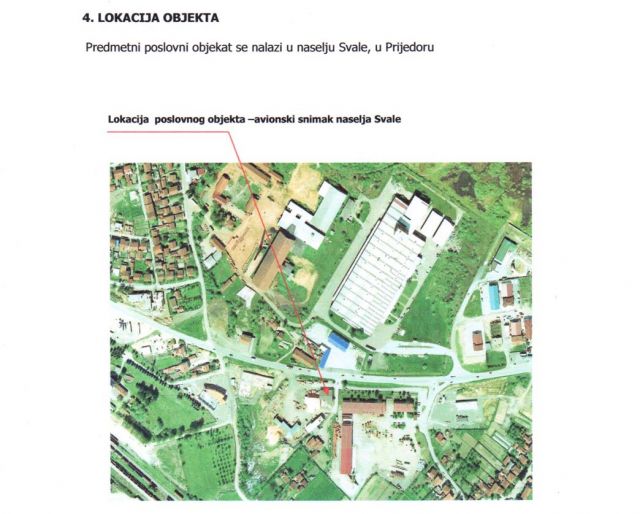 Na ulazu u grad Prijedor, iz smjera Banja Luke, uz sam magistralni put Prijedor – B. Luka, u naselju Svale, na udaljenosti 2 km od centra grada, prodaje se nekretnina, koja je u naravi samostojeći poslovni objekt upisan u ZK uložak broj 5726, KO Prijedor, s pripadajućim zemljištem.