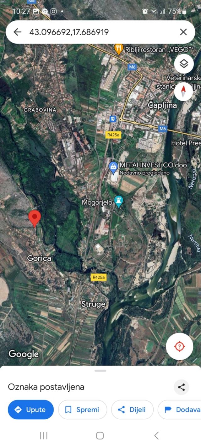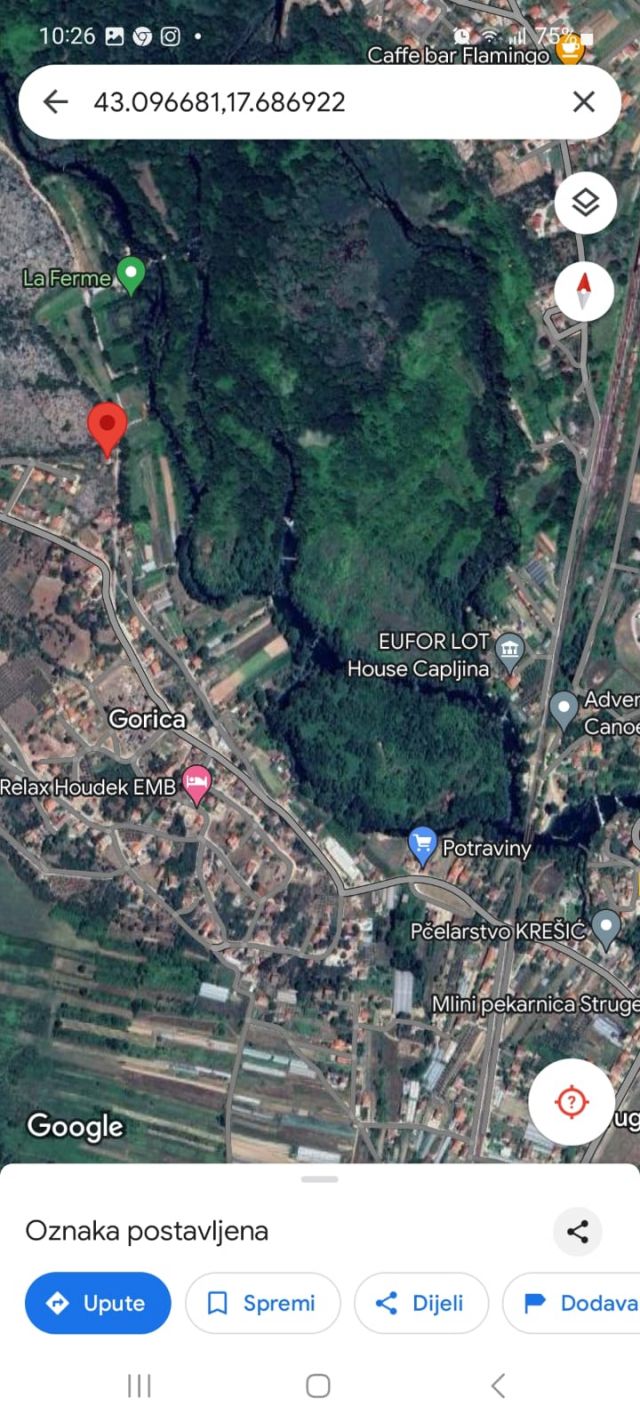 Prodaje se kuća sa okućnicom u mjestu Gorica-Čapljina (udaljenost od centra grada je 5 km), u blizini rijeke Trebižat (cca 70m). Blizina graničnog prijelaza Gabela Polje je 6 km, 20 km do mora. Udaljenost Međugorja je 17 km. Vodopad Kravice je udaljen 22 km. Park prirode Hutovo blato je udaljen 13 km. Udaljenost Mostara je 38 km.