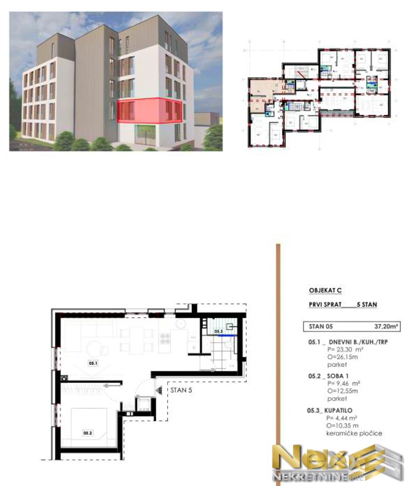 Stan se sastoji od: hodnika, kuhinje, dnevnog boravka sa trpezarijom, kupatila i spavaće sobe.