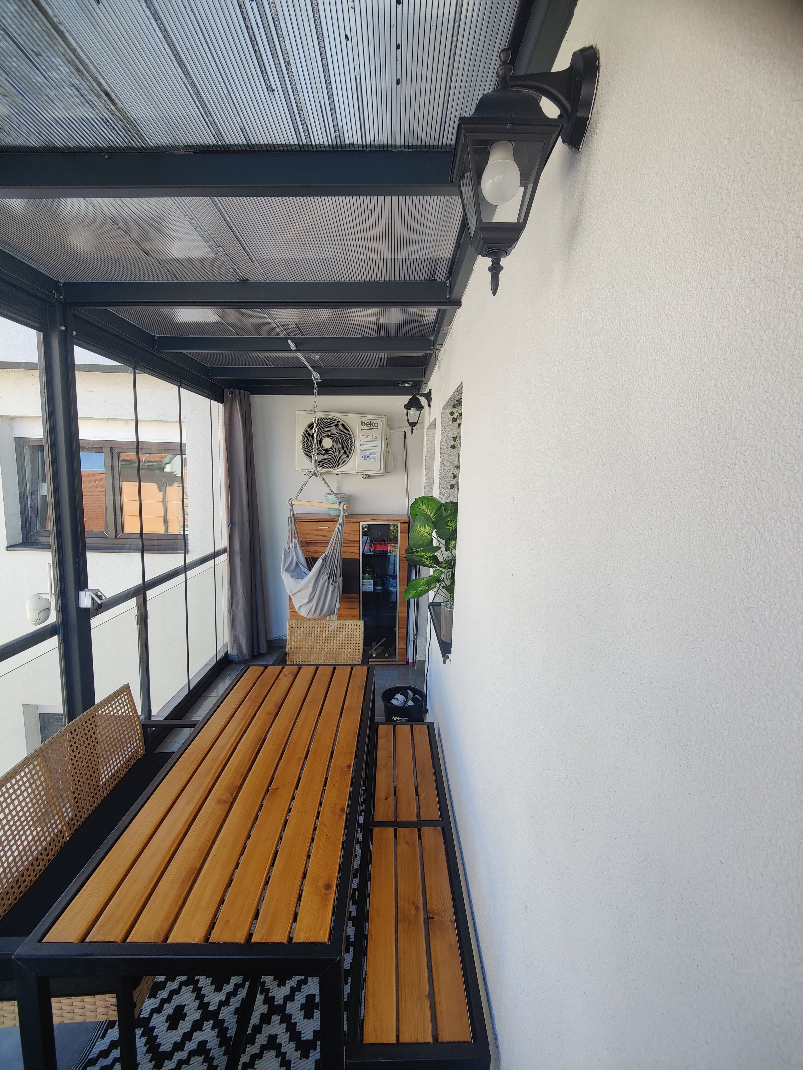Stan je kompletno opremljen novim, modernim namještajem (opcija kupovine sa ili bez namještaja) i ističe se visokim stepenom kvaliteta završne obrade. Opremljen je podnim grijanjem i savremenim klima uređajem sa funkcijom grijanja i hlađenja, čime se osigurava ugodan boravak tokom cijele godine. Balkon je stručno natkriven i zatvoren, pretvoren u dodatni praktičan prostor koji se može koristiti kao kutak za odmor, radna zona ili produžetak dnevnog boravka.