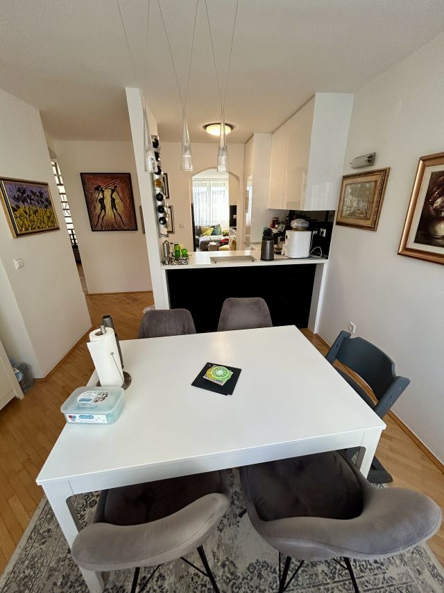 Sastoji se od hodnika, dnevnog boravka, kuhinje, trpezarije, ostave, toaleta, radne sobe sa izlazom na balkon, unutrašnje stepenice vode na sprat koji se sastoji od tri spavaće sobe, vešeraja, kupatila sa tuš kabinom i djakuzijem. Vanjska stolarija je PVC, unutrašnja stolarija je drvena. Pod je parket i keramika. Grijanje je etažno plinsko, posjeduje i dva klima uredjaja. Ulazna vrata su blindirana. Stan je renoviran, krov je uradjen nanovo i prodaje se namješten. Nalazi se na lijepoj lokaciji za ugodan život na pet minuta hoda do Baščaršije i strogog centra grada u blizini javnog prijevoza i brojnih marketa.