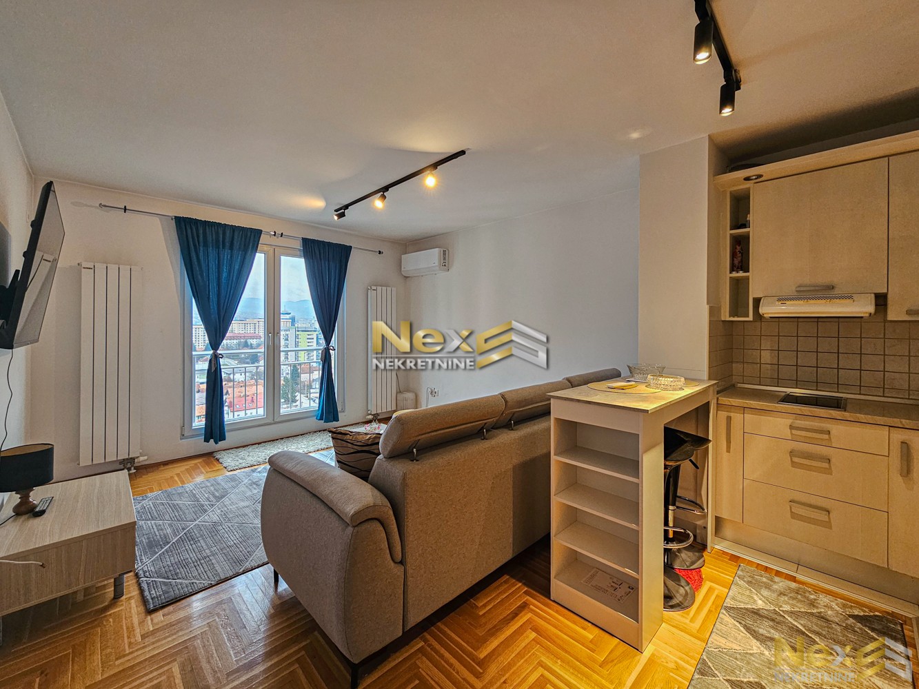 Iznajmljuje se namještena garsonjera, sa otvorenim pogledom površine 33,24 m2, pozicioniran na dvanaestom spratu stambene zgrade sa dva lifta u naselju Stup - Tibra II.